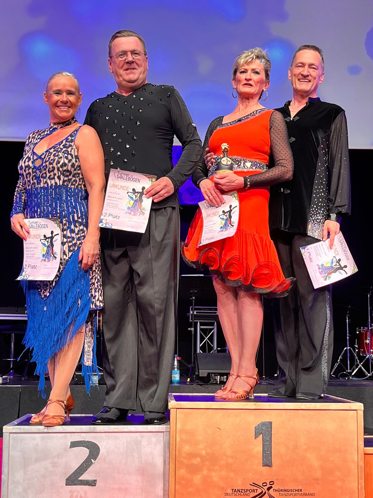 Zum inzwischen 7. "Turnier am Saalebogen" hatte der "GTC Saalebogen die TSA des 1. SSV Saalfeld 92 e.V." in die Stadthalle nach Bad Blankenburg eingeladen und gleich 5 Paare unseres Vereins sind diesem Ruf gefolgt. In einem wirklich spektakulären Ambiente und einem absolut professionell durchgeführten Turnierwochenende (vielen Dank und großes Lob an die Ausrichter) konnten sich alle 5 Paare gegen zum Teil sehr starke Starterfelder behaupten und fanden vielfach den Weg in die jeweiligen Finalrunden und auf die Treppchenplätze. Hier die vollständigen Ergebnisse:
