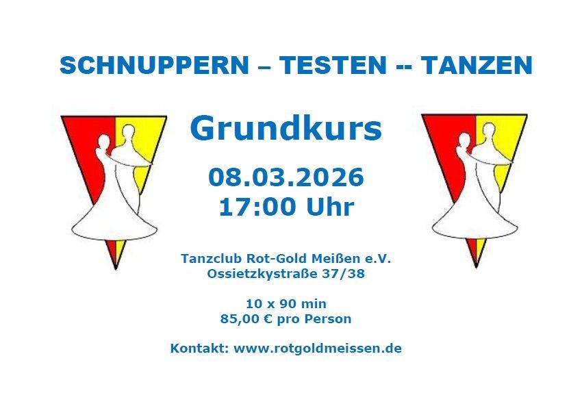 Nachdem die Grundkurse in den letzten 4 Jahren so große Erfolge waren, bieten wir auch im Jahr 2026 allen tanzbegeisterten Anfängern und Fortgeschrittenen die Möglichkeit, erste Schritte in den Standard- und lateinamerikanischen Tänzen zu erlernen oder die bereits erlernten Kenntnisse zu verbessern. Schnell anmelden, denn die freien Plätze sind begehrt und somit begrenzt!